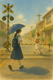 踏切が開くと、女子高生は小走りで夏の街へと消えていきました。